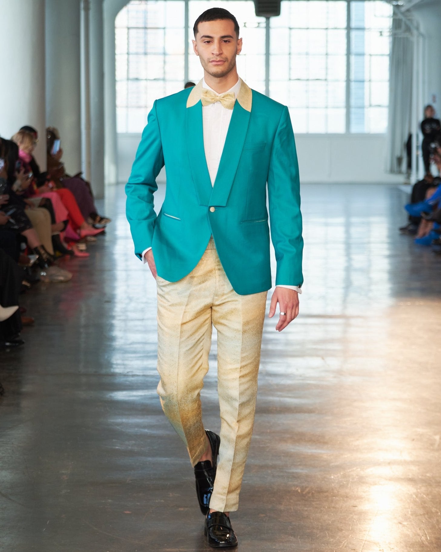 Upgrade your formal wear with our expertly crafted Sleek Turquoise and Yellow Tuxedo Blazer. The bold color combination and shimmery trousers will make you stand out at any event. Look and feel confident in this statement piece.